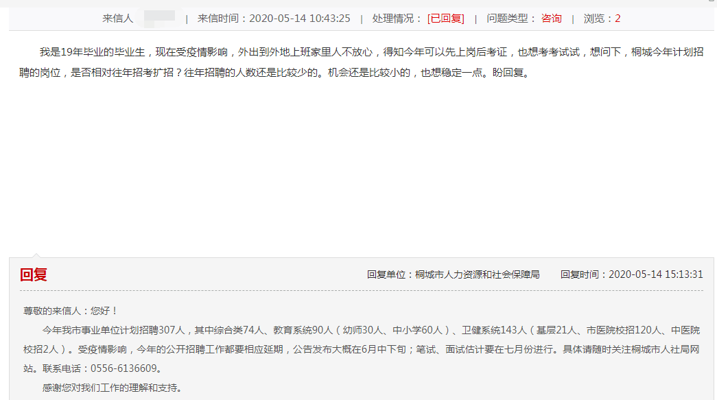 5月14日考生向桐城人社局提問事業單位招聘情況,以下是詳細內容: