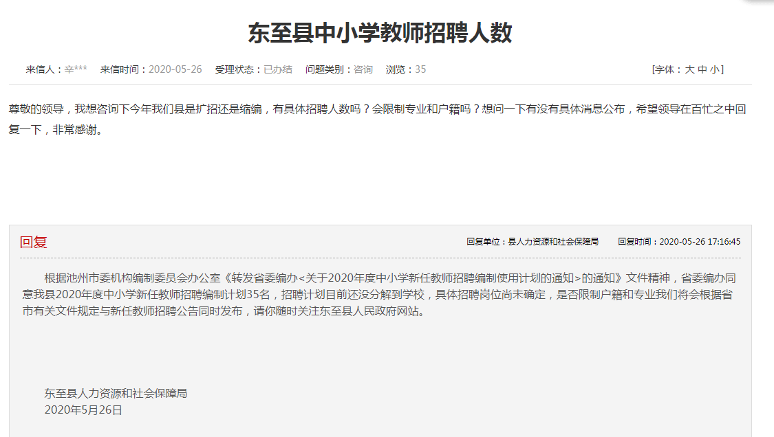 縣人力資源和社會保障局回復根據池州市委機構編制委員會辦公室《轉發省委編辦<關于2020年度中小學新任教師招聘編制使用計劃的通知>的通知》文件精神,省委編辦同意我縣2020年度中小學新任教師招聘編制計劃35名,招聘計劃目前還沒分解到學校,具體招聘崗位尚未確定,是否限制戶籍和專業我們將會根據省市有關文件規定與新任教師招聘公告同時發布,請你隨時關注東至縣人民政府網站。