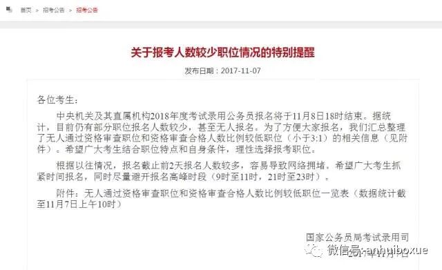 國家公務員局今日發布:《關于報考人數較少職位情況的特別提醒》。